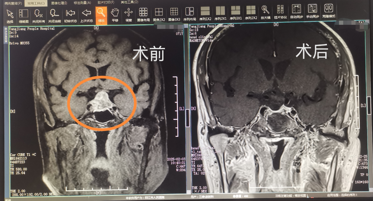 面对这一复杂病例,我院神经外一科一区刘金阳主任医师团队进行了严密的术前评估和准备,最终决定采用微创手术方式——经鼻腔神经内镜垂体瘤切除术。手术过程中,医生精准切除了肿瘤并清除了肿瘤出血,成功解除了对视神经、视交叉和动眼神经的压迫。