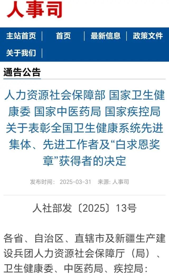 3月31日,人力资源社会保障部、国家卫生健康委、国家中医药局、国家疾控局发布全国卫生健康系统先进集体、先进工作者、“白求恩奖章”获得者表彰名单。