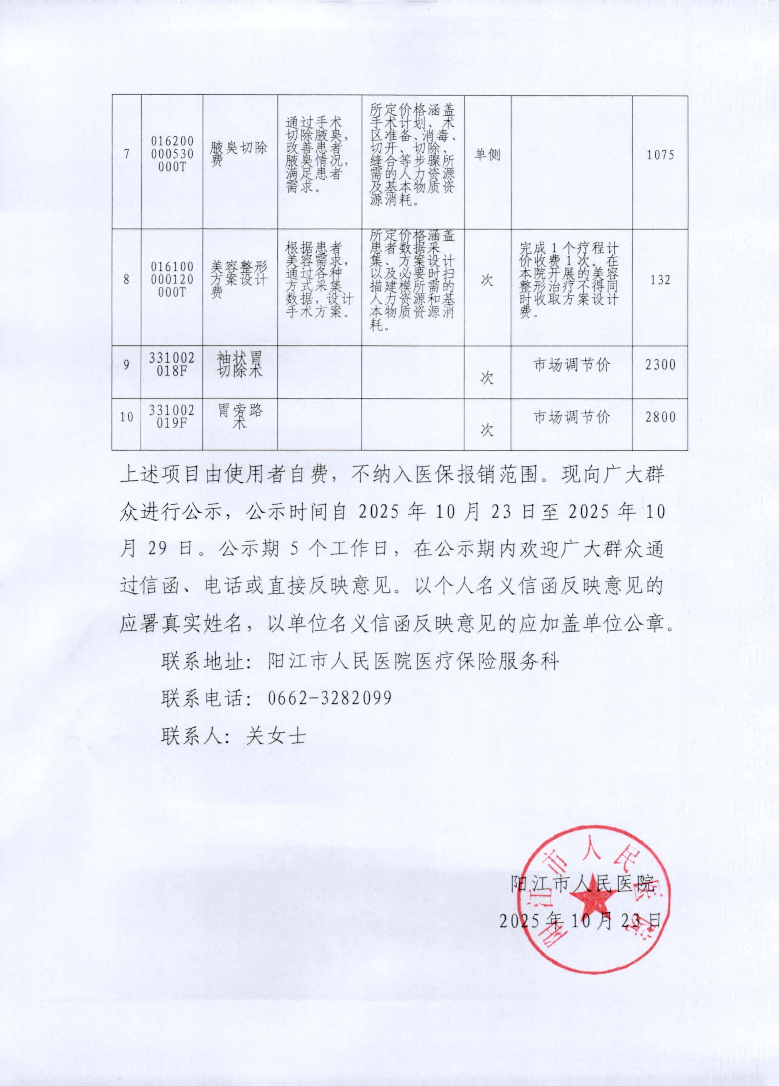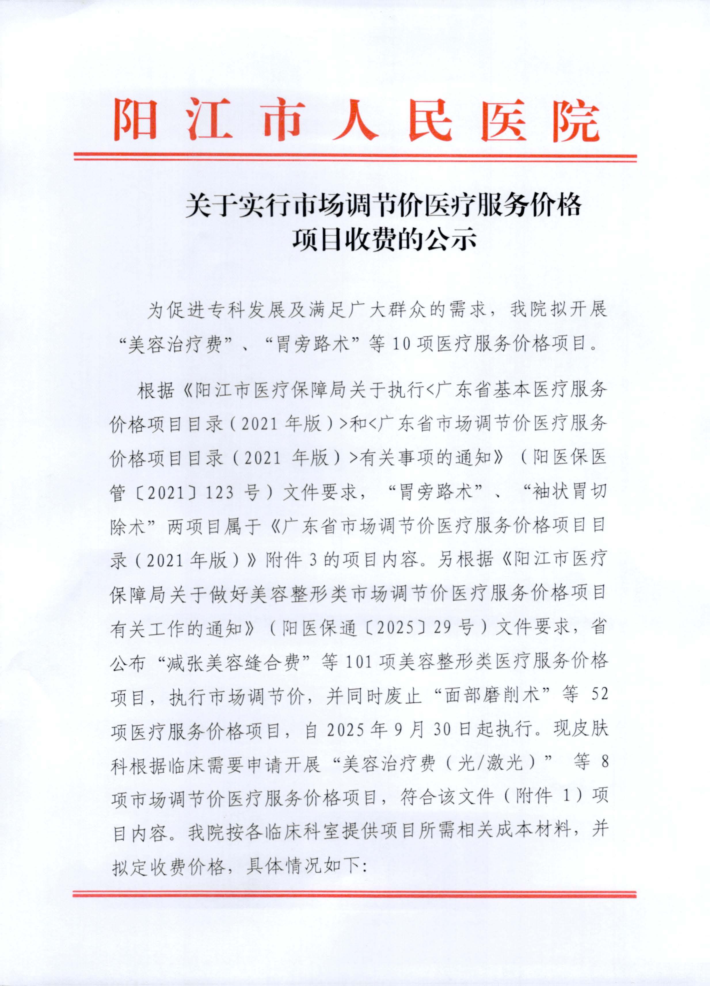 关于实行市场调节价医疗服务价格项目收费的公示20251023