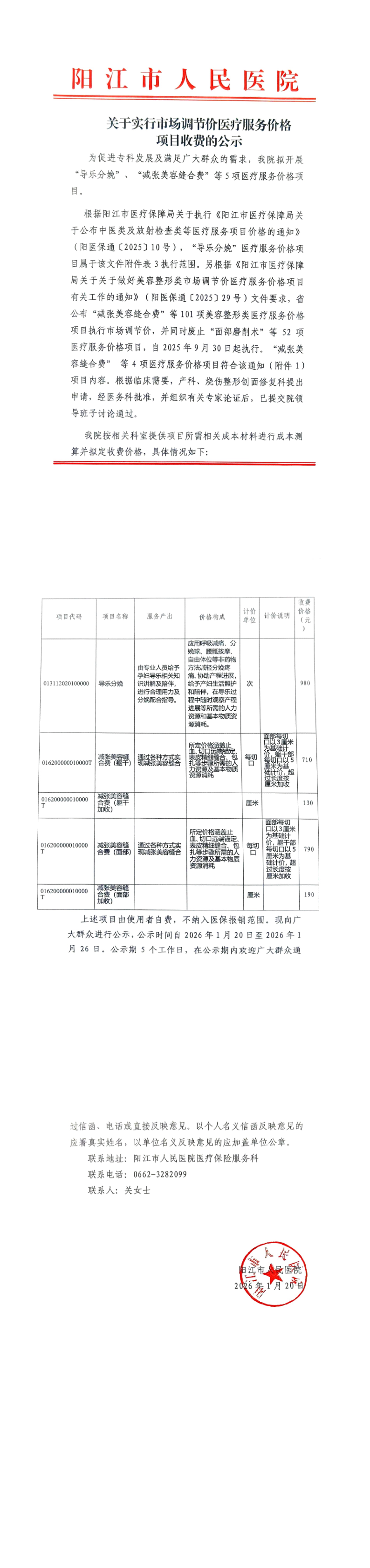 关于实行市场调节价医疗服务价格项目收费的公示20260120